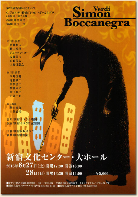 2016年8月27〜28日公演 新宿区民オペラ第22回公演 全3幕原語上演・日本語字幕付 2012年8月27日(土) 開場17:30/開演18:00 2012年8月28日(日) 開場13:30/開演14:00 <合唱募集 受付中> 興味のある方はぜひご参加ください。